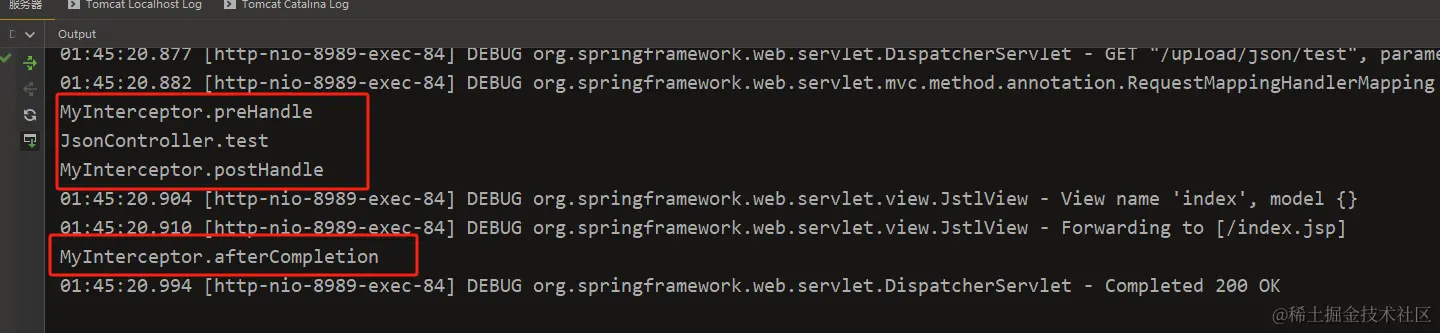 @RequestMapping("test") public String test() { System.out.println("JsonController.test"); // throw new RuntimeException(); return "index"; }按预期执行顺序执行