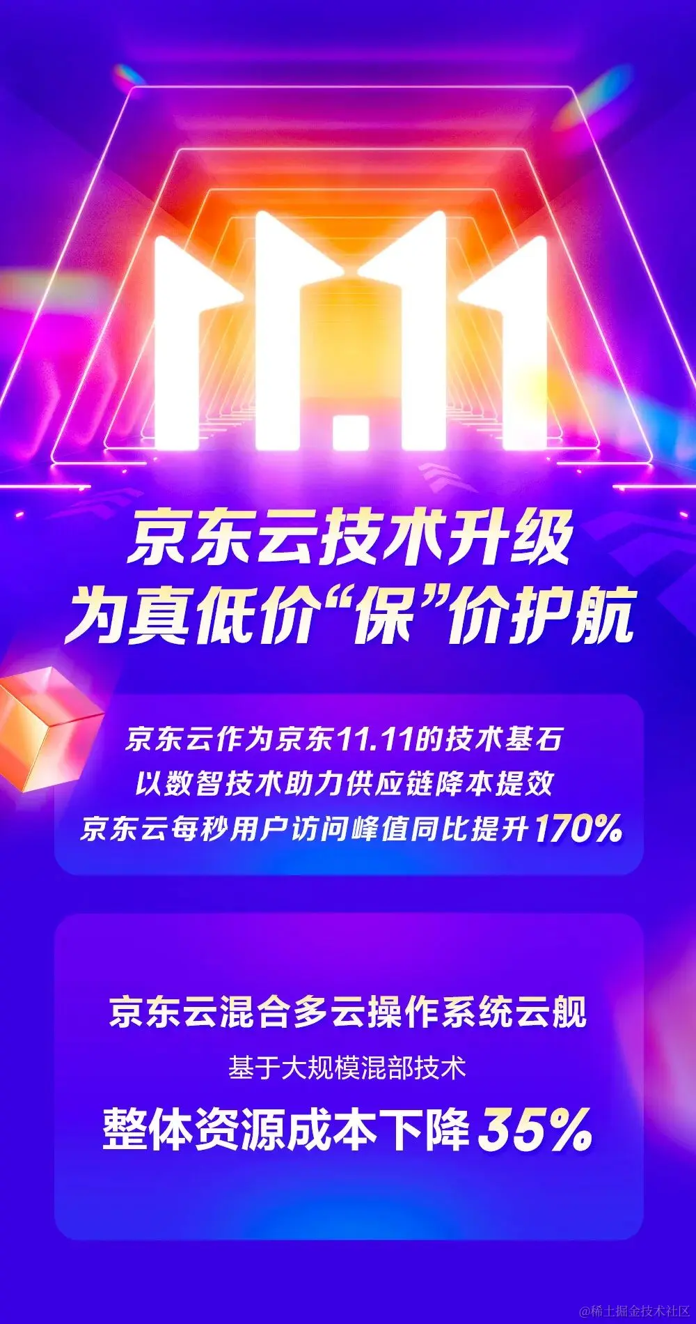 对业务系统稳定性冲击极大的618,11.11等购物节场景,京东云依靠自主研发的混合多云操作系统云舰,腾挪现有资源,秒级精准调度,面对数亿级别的QPS流量洪峰时,仍能保证业务系统稳定0事故,并实现资源成本下降35%。