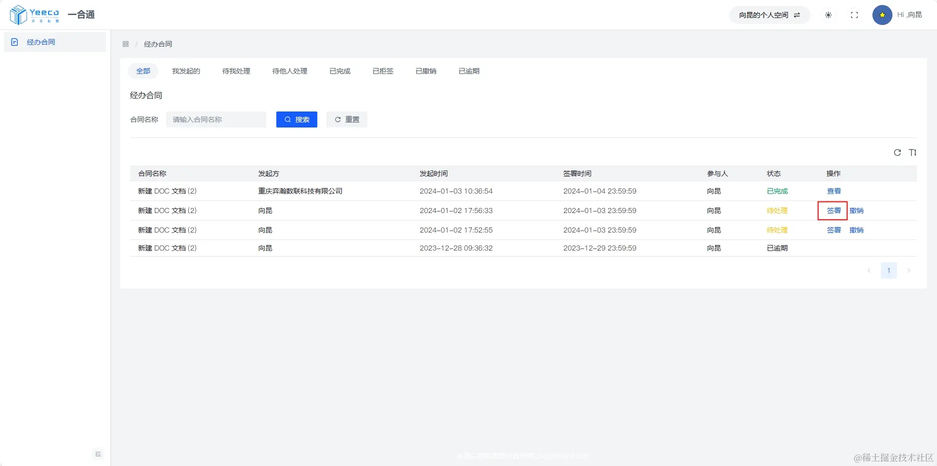 Web 用户端,支持在线签署合同,点击“签署”跳转到相应的签署页面