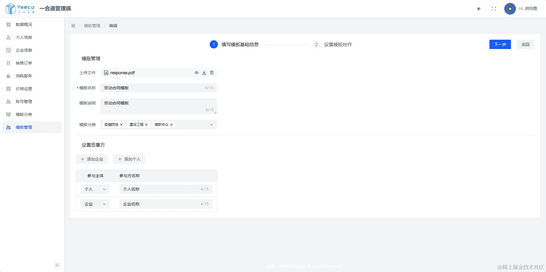在设置合同横版的时候,可提前设置好该模板预设好的签署方“个人”、“企业”,目前单个横版最多支持10个签署对象