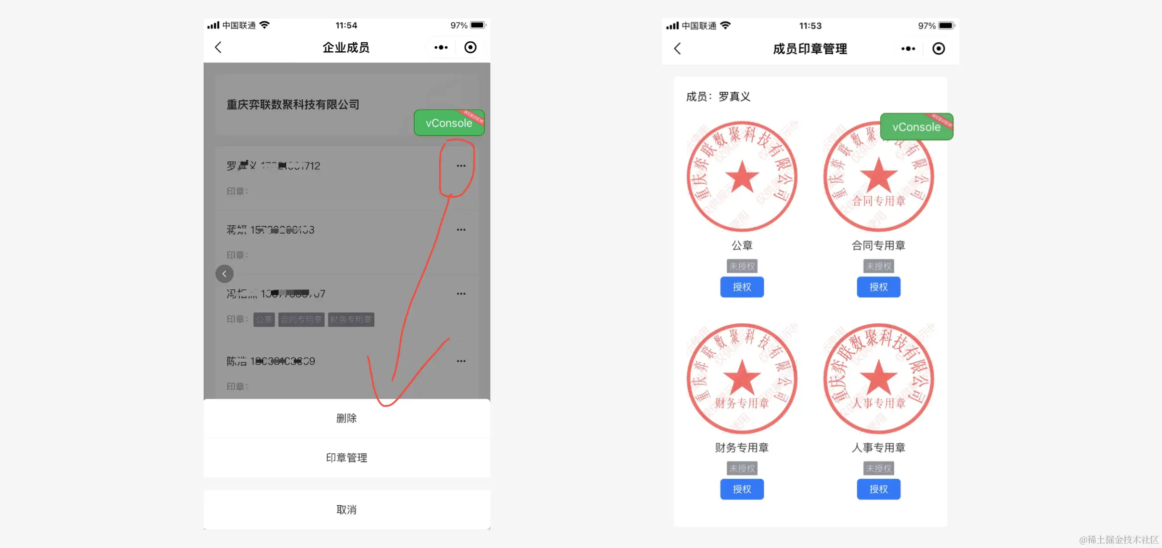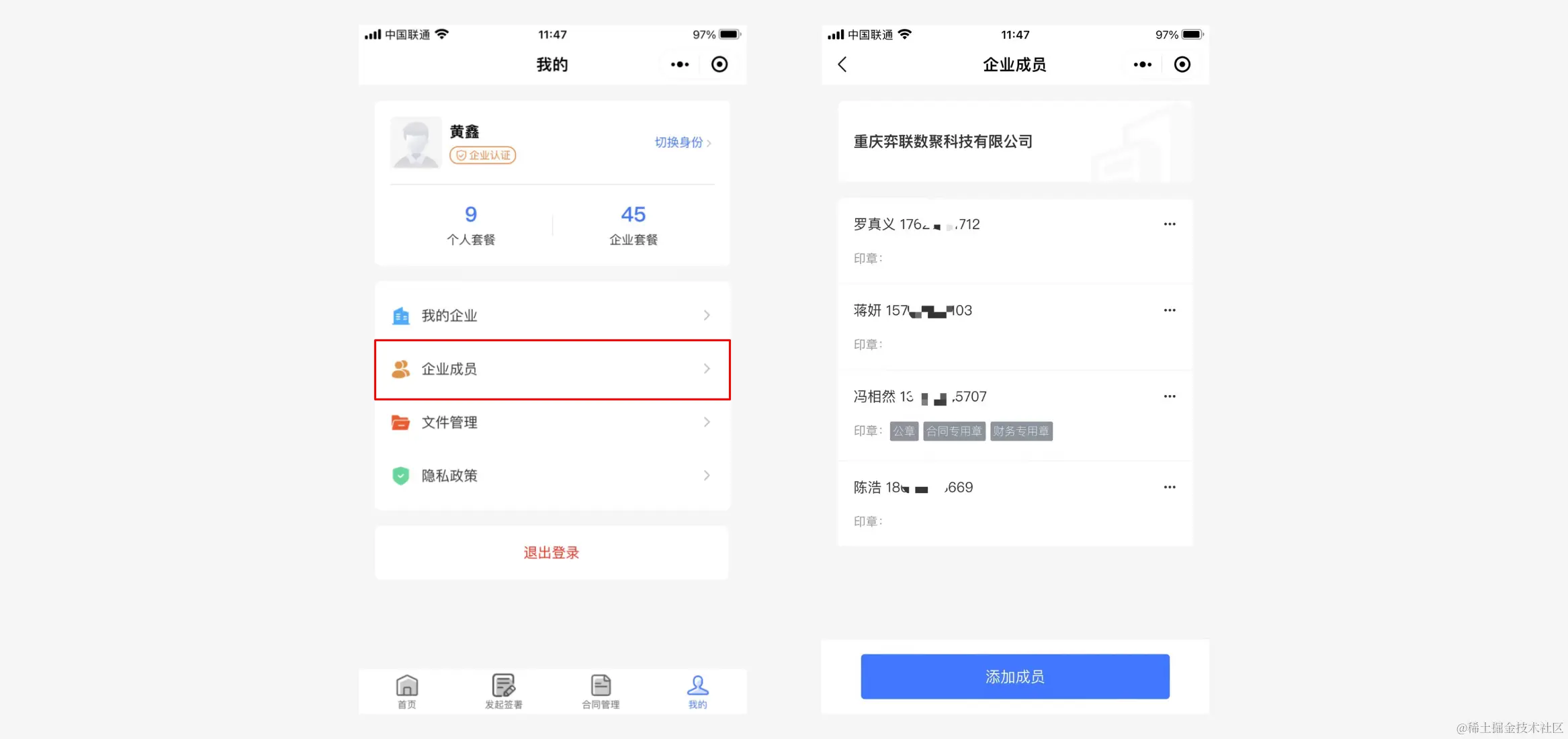 作为企业管理人员,可以管理企业成员,同时可以授权企业成员是否拥签署权限