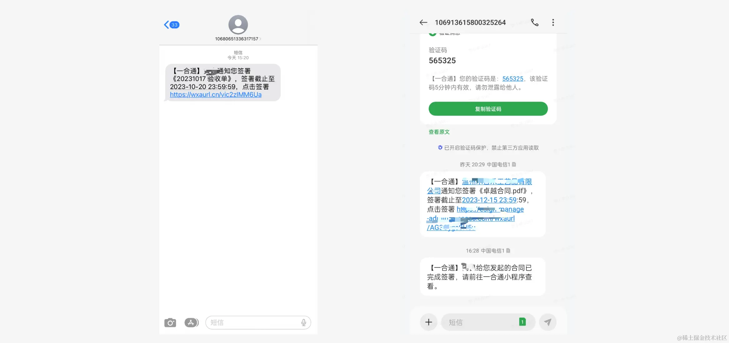 参与签署的人可以收到签署的短信信息提醒,在有效期内点击链接可以到H5或者小程序里面进行签署,所有签署人都签署完成之后有短信通知提示