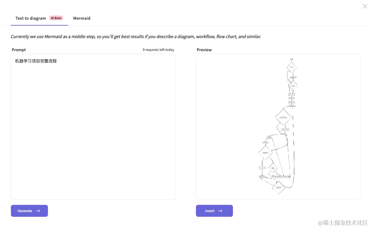 选择Text to diagram即可,它的原理是使用AI将prompt指令转化为Mermaid,然后再从Mermaid转为diagram图。