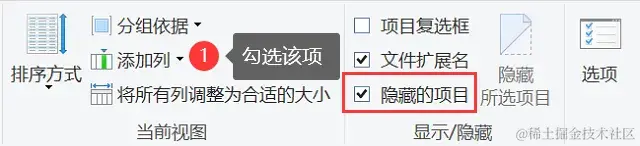 2.在【显示/隐藏】 部分,确保 【隐藏的项目】选项已经被勾选;