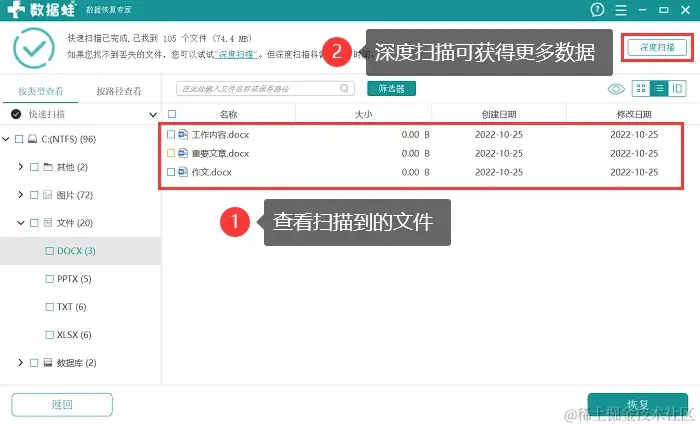 4.软件会先快速对u盘进行先扫描,扫描完成后,用户可对结果进行查看,如果此时扫描到的数据比较少,部分需要恢复的文件没有扫描到,可以点击 【深度扫描】 获取更多数据;