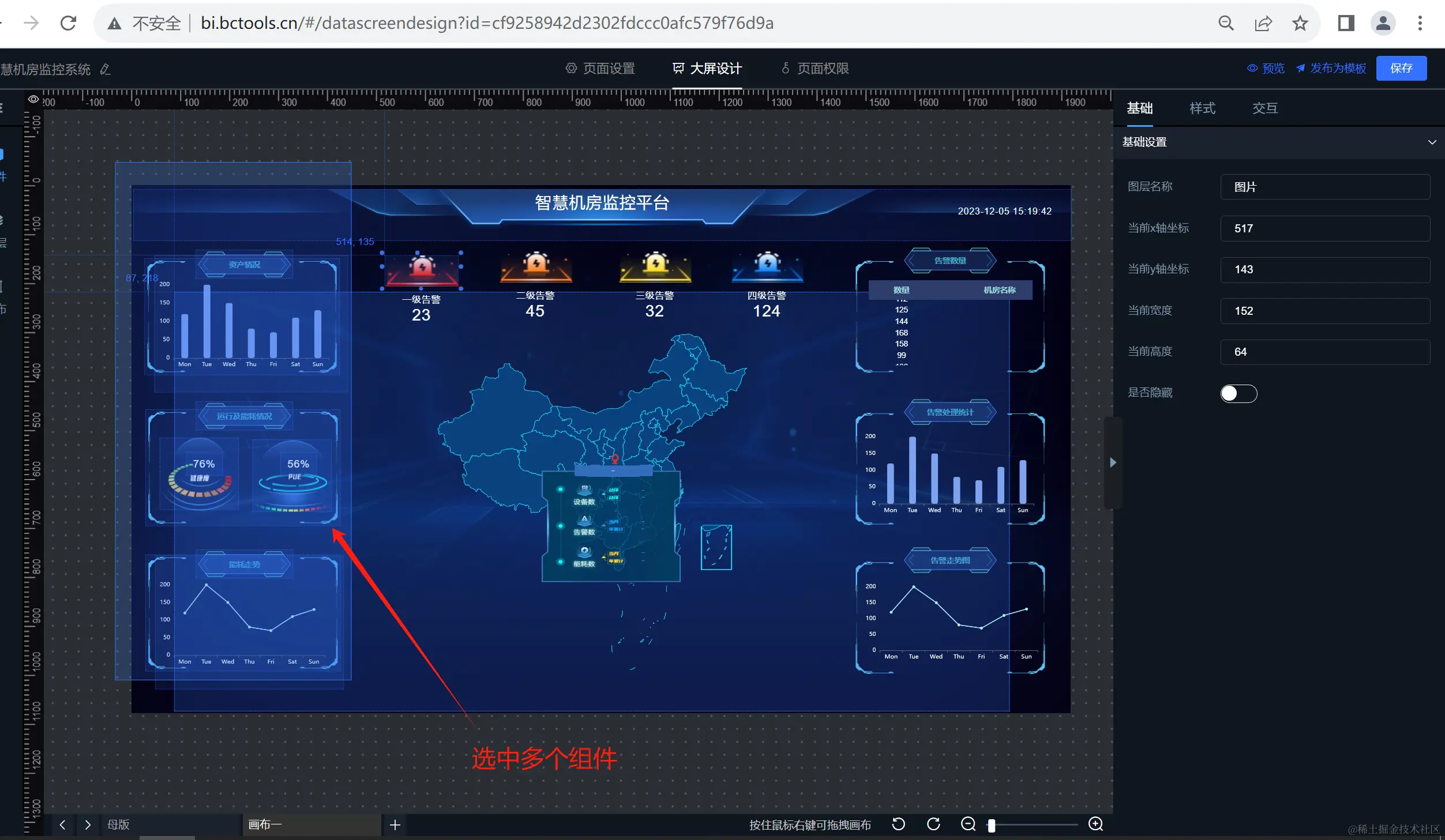 用户在一个大屏界面上同时选择多个组件的功能后,可以同时移动多个组件。例如图表、文本框、按钮等。一旦选择了多个组件,用户可以同时对它们进行操作,如调整大小、移动位置、更改颜色或样式等。