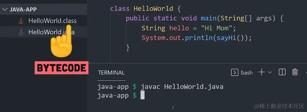 程序完成后,使用编译器生成一个 .class 文件,其中包含字节码。