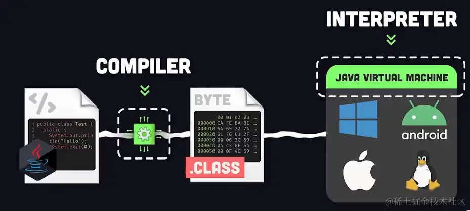 Java 的创新之处在于,它不是像 C 或 C++ 那样编译为机器代码,而是编译为可以在任何操作系统上运行而无需重新编译的字节码,这是通过使用 Java 虚拟机 (JVM) 执行代码来实现的。