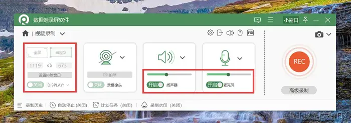 步骤2:在视频录制模式中,我们可以选择需要录制的电脑屏幕区域,然后打开麦克风和扬声器录入声音。