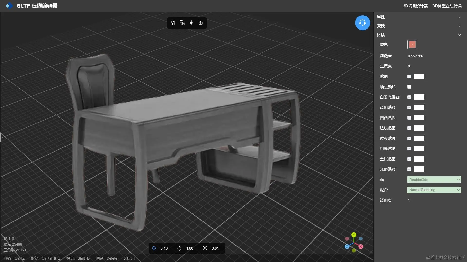 GLTF 编辑器 -NSDT 不仅可以设置3D模型纹理贴图,还可以设置模型的几何原点、以及对有相同材质属性的mesh进行合并,实现模型轻量化,是一款不可多得的实用型在线模型编辑工具。