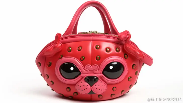 草莓形状小狗包包,色彩对比鲜明的风格,超现实,软边,狂热派对系