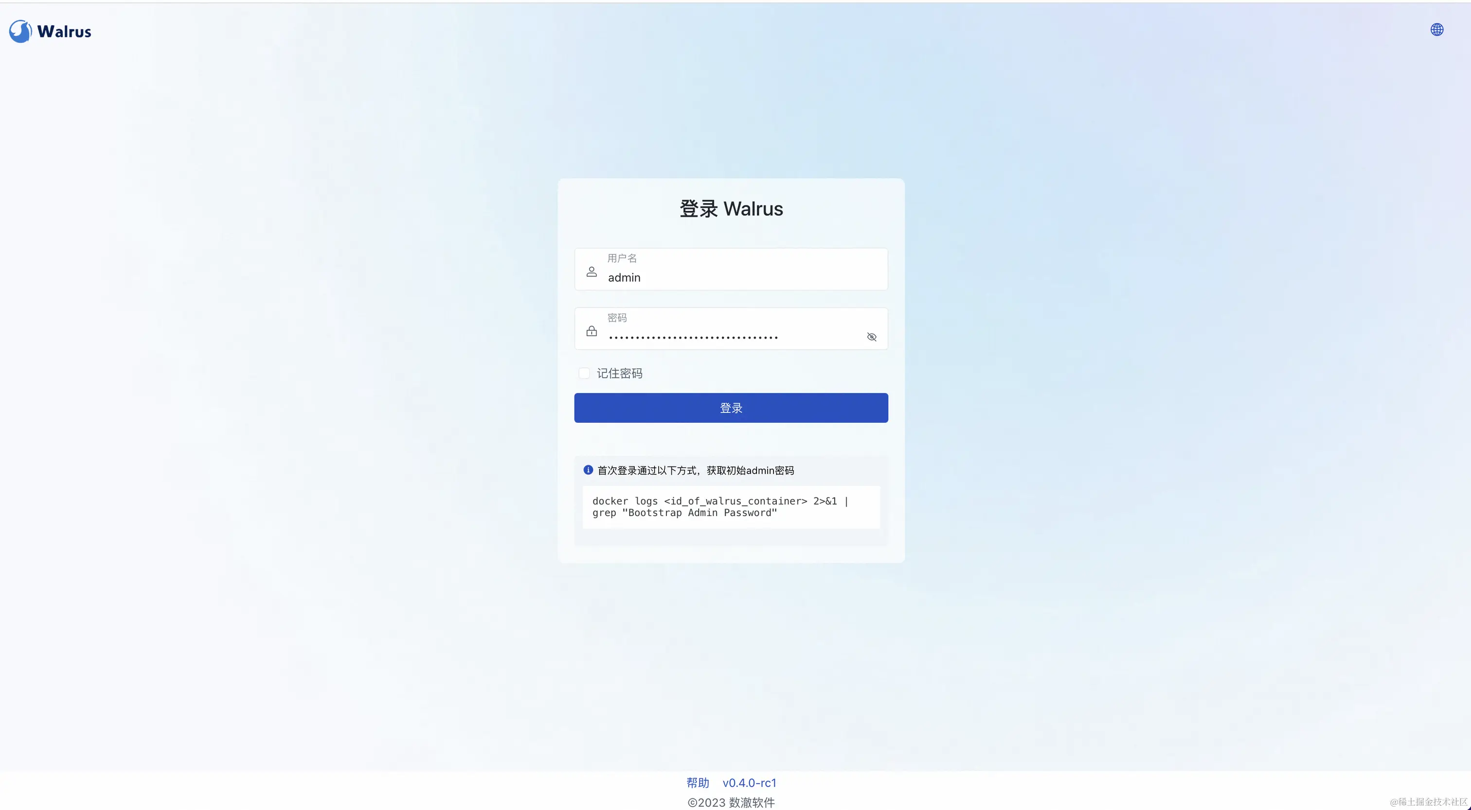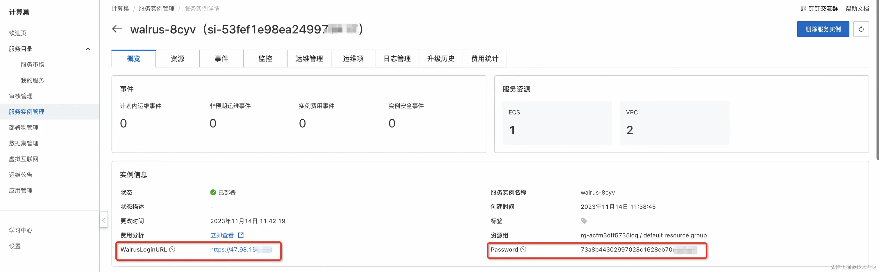 通过服务实例访问Walrus。进入到对应的服务实例后,可以在页面获取到Walrus登录页面的地址,以及admin账号的初始密码。