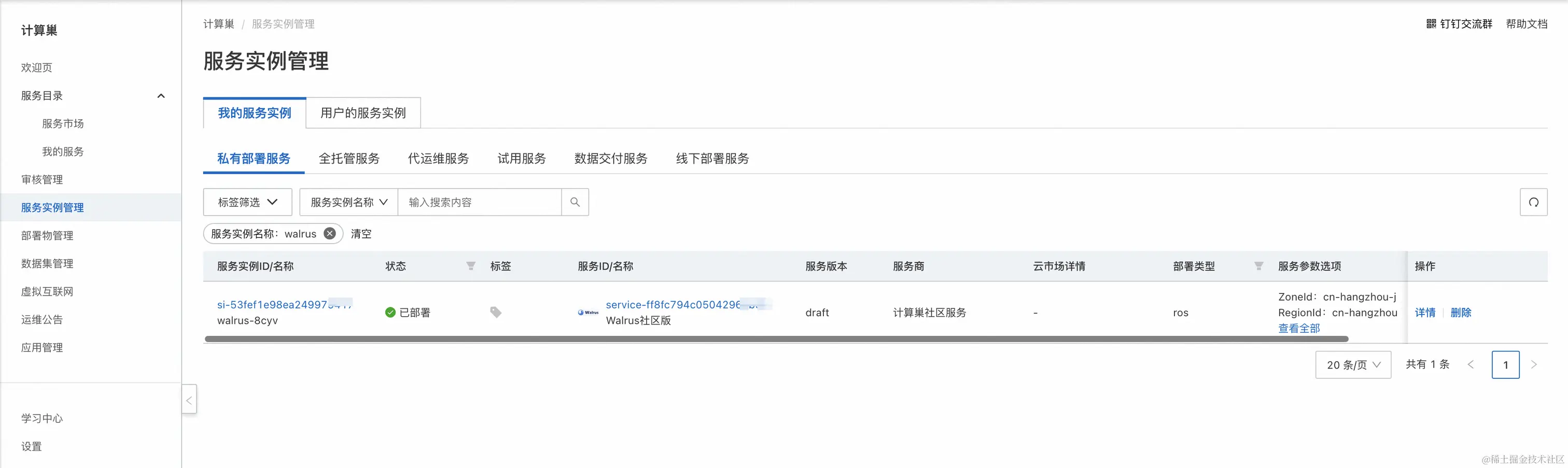阿里云计算巢是一个给企业应用服务商和其客户的服务管理PaaS平台,为客户提供云上软件一键部署的能力。计算巢推出了 Walrus 快速部署的功能,只需选择少量的参数,就能部署一套 Walrus 的环境。