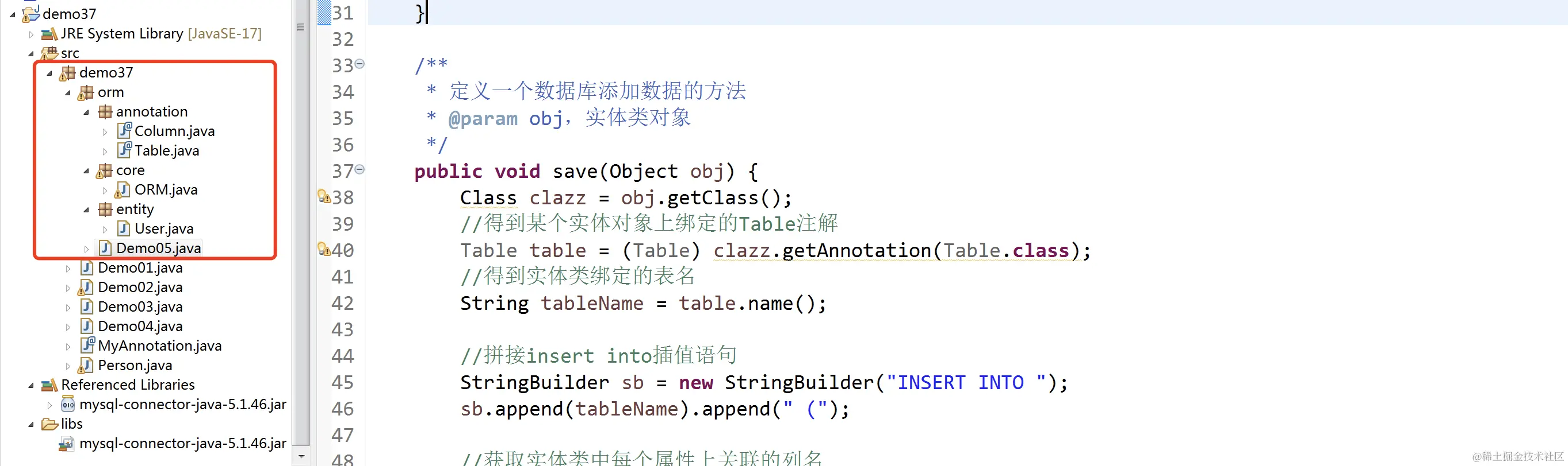 上述代码定义了一个ORM类,其中save()方法用于将对象保存到数据库表中,close()方法用于关闭数据库连接。save()方法首先使用反射获取对象的类信息和注解信息,然后根据注解信息生成SQL语句并执行插入操作。
