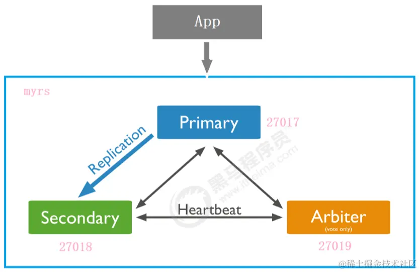 - 如果只加入27019仲裁节点成员,则主节点一定是27017,因为没得选了,仲裁节点不参与选举, 但参与投票