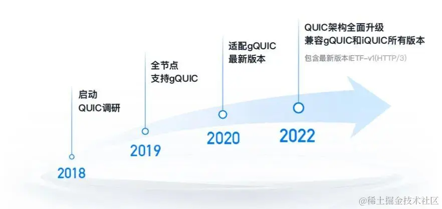 QUIC于2012年由谷歌提出,并应用在谷歌各业务场景。2015年谷歌将QUIC协议提交给IETF官方组织,2016年正式成立IETF工作组,随着2022年RFC9114标准落地,H3正式发布,成为继HTTP1.X、H2以后第三个重要的HTTP版本。