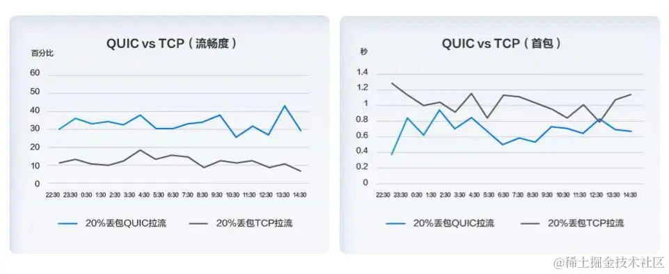 网宿基于业务场景和网络环境的实战也发现,QUIC优化效果明显。以直播业务为例,使用同一服务器,推两路1M码率的直播流到同一边缘节点,在丢包20%的情况下,QUIC的流畅度比TCP高20%,首包时间比TCP少0.2-0.8秒,传输性能显著提升。