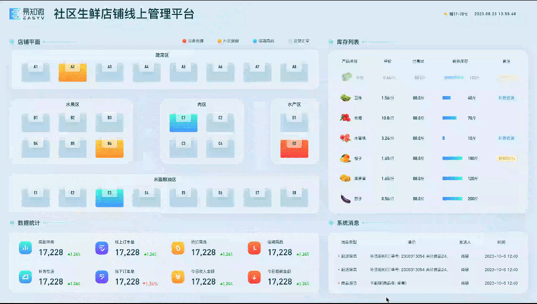 易知微推出社区生鲜店铺线上管理平台,该模板适用于「果蔬生鲜超市」等小型营运场所,从店铺平面、商品店铺统计、库存列表等角度,对整体店铺运营做统一管理。