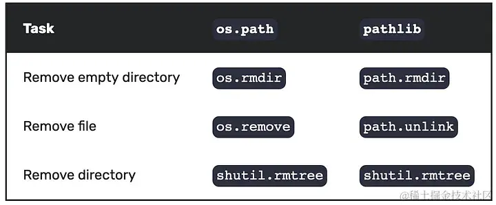 | 移除此文件或符号链接 | os.remove(), os.unlink() | Path.unlink() |