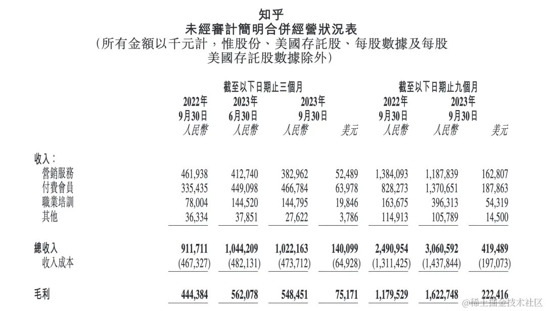 从数据来看,三季报显示,2023年第三季度知乎公司平均每月活跃用户 (MAU) 为 1.105 亿。最新季度该公司平均每月订阅会员为1480万,相较2022年同期增长35.9%。