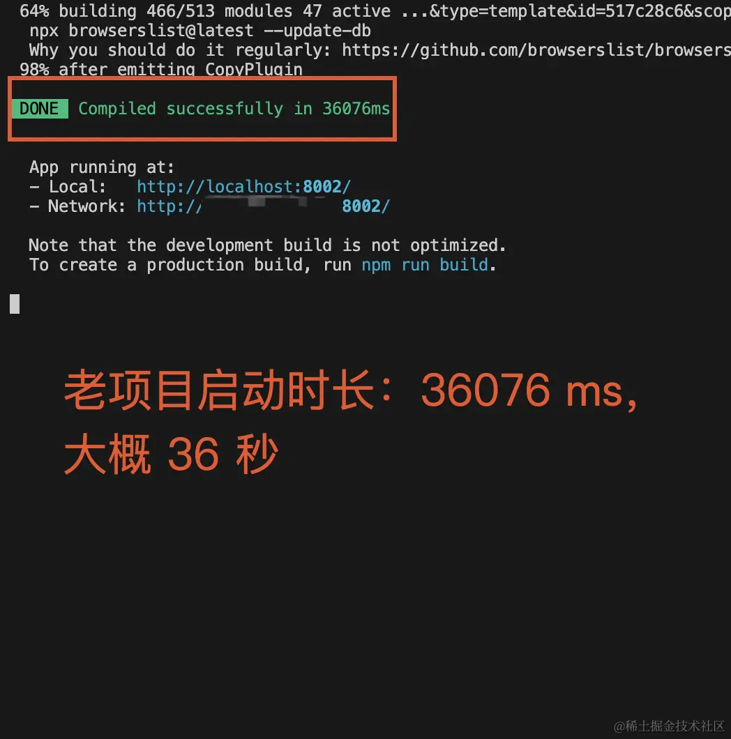 如下图是新旧项目启动时长对比,Vite 启动速度,快了 30 多倍;