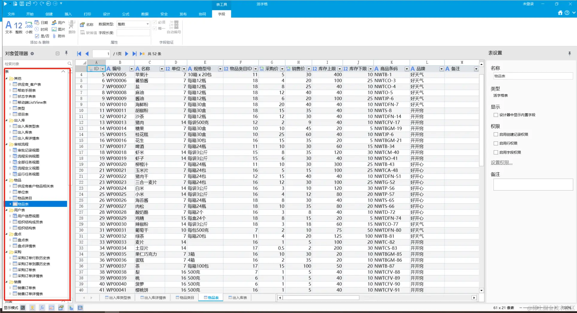 无论是传统代码开发,还是使用低代码开发,数据建模和数据库的设计都是最基础的一个步骤,系统本质上就是对各种数据的一个处理和展示。有了良好的数据库设计,那么后边设计系统的界面和命令逻辑就会更方便快捷。根据上面的需求可以我们可以得到我们的数据库中需要有库存模块的出入库相关的表,采购模块采购相关的表,销售模块相关的表。然后在活字格中去创建这些表,活字格本身的数据模型引擎拥有内建小型数据库,可直连主流数据库(sql server,mysql,Oracle,MariaDB,PostgreSQL,达梦等),提供可视化数据模型(表、字段、关联关系等)与查询视图设计能力,提供专业模型驱动开发体验是有内建小型数据库。也支持从已有的excel,access数据导入建表。