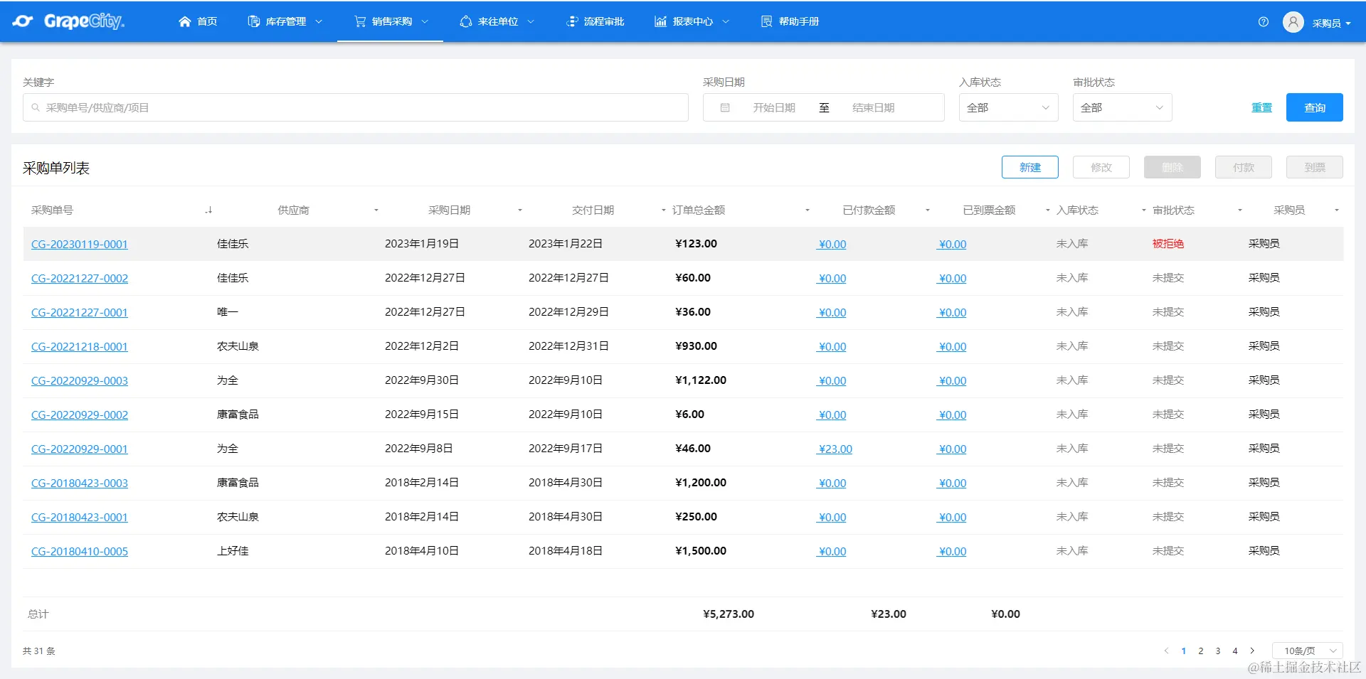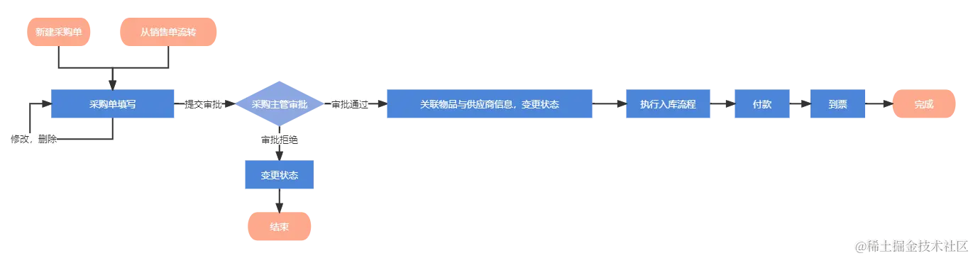 采购管理:对物品采购信息的增删改查,提供了审批流程。其中,采购的来源除了新建采购单,也支持从销售单直接流转。