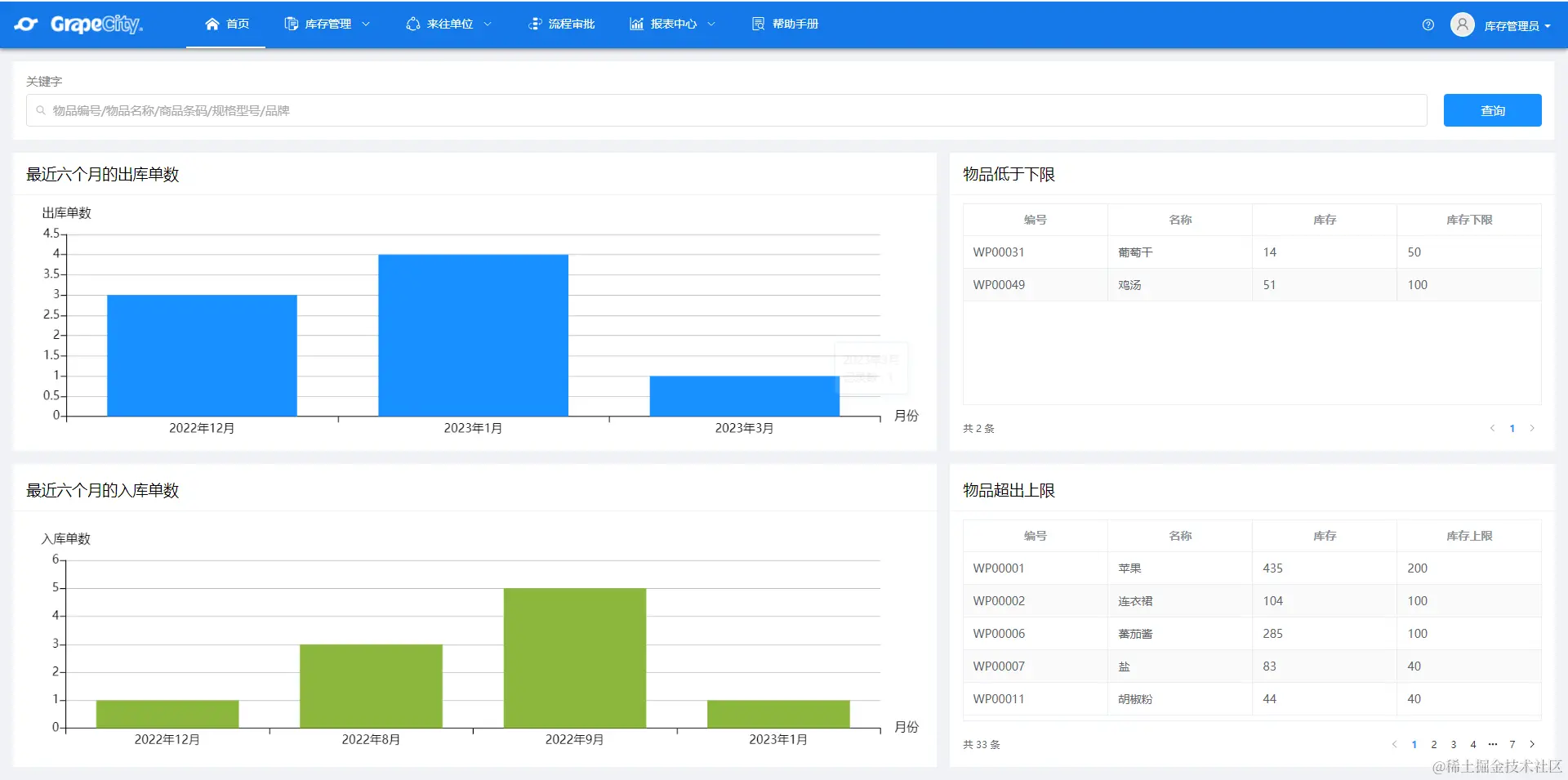 首页Dashboard:用于展示和出入库相关的图表数据。