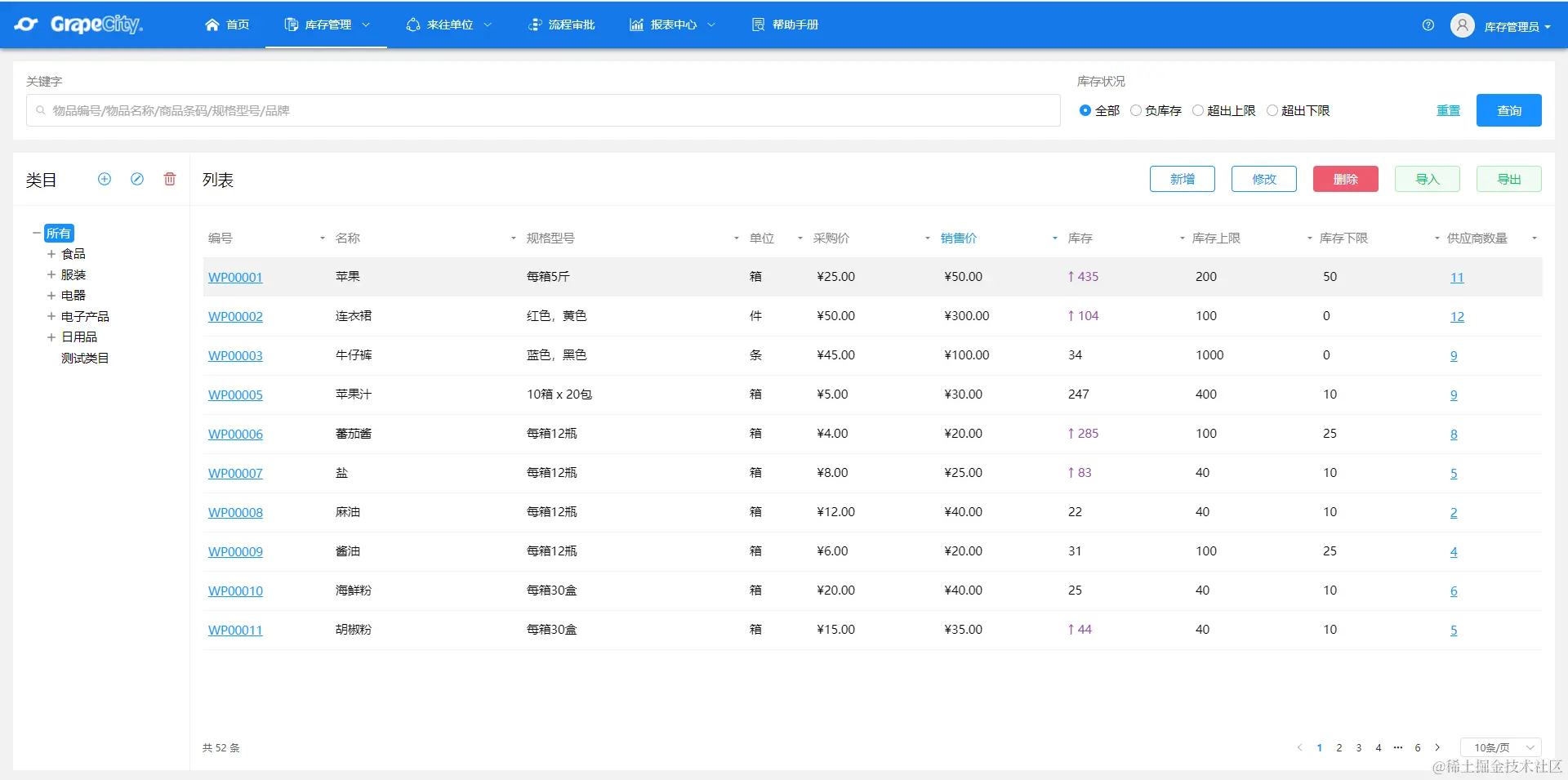 物品管理:对物品信息的增删改查,包括了类目,库存,供应商等信息,支持导入导出。