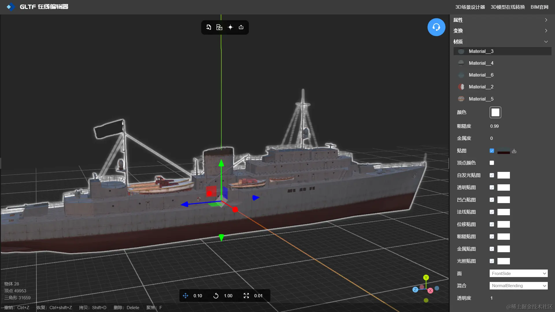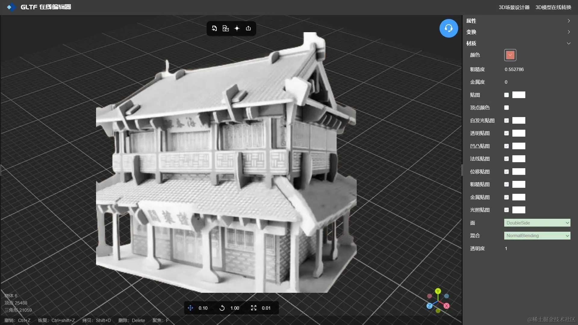 GLTF 编辑器 -NSDT 不仅可以设置3D模型纹理贴图,还可以设置模型的几何原点、以及对有相同材质属性的mesh进行合并,实现模型轻量化,是一款不可多得的实用型在线模型编辑工具。