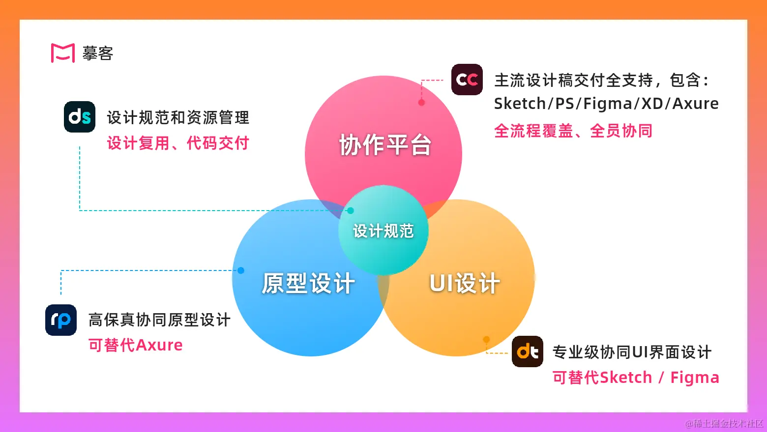摹客是一个强大的全流程在线协同设计平台,旗下包含“摹客协同”、“摹客RP”、摹客“DT”、“摹客DS”等多款专业设计工具,各款工具的用途和特点可参考配图。对于协同设计来说,保证覆盖的场景足够全是非常重要的,只有覆盖率足够高才能最大幅度地承载整个设计团队中的各种角色、习惯和资源——这也是我优先推荐摹客的原因,因为在国内能同时具备原型 + UI + 协同平台 + 规范全能力覆盖的,唯此一家。