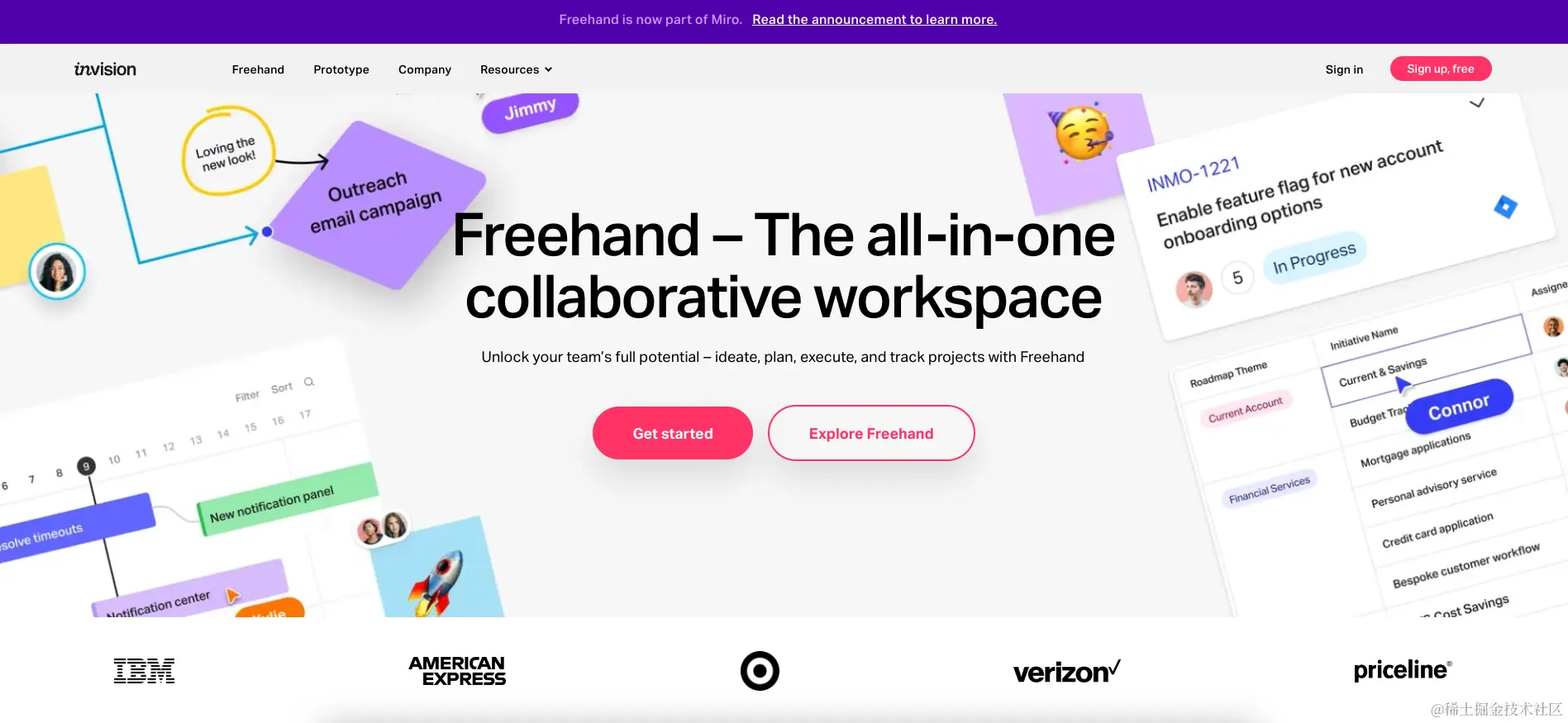 Invision一个专注于原型设计和设计协同的平台,聚焦实时评论和反馈功能。早期的Invision本身完全不提供设计能力,它需要用户从其他软件中上传设计稿后,再利用热区制作可跳转的原型。Invision后来又推出了白板相关的功能Freehand,但已在2023年底被Miro收购。虽然Freehand目前还可以继续使用,但后续还是建议直接使用Miro会更有保障。