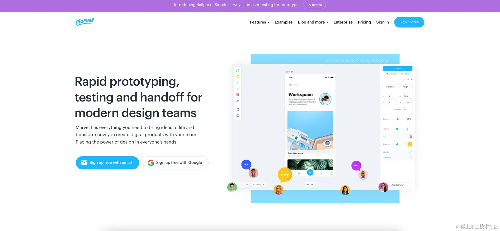 Marvel是一个简单易用的原型设计工具,主打实时协同和用户测试。相比其他产品,Marvel在用户测试角度的能力是独一无二的,支持视频访谈录制、用户操作回溯和智能分析等功能,帮助设计团队发现用户体验设计中潜在的问题。如今,Marvel团队更进一步地推出了Ballpark功能,增强自己在用户调研方面的产品优势。