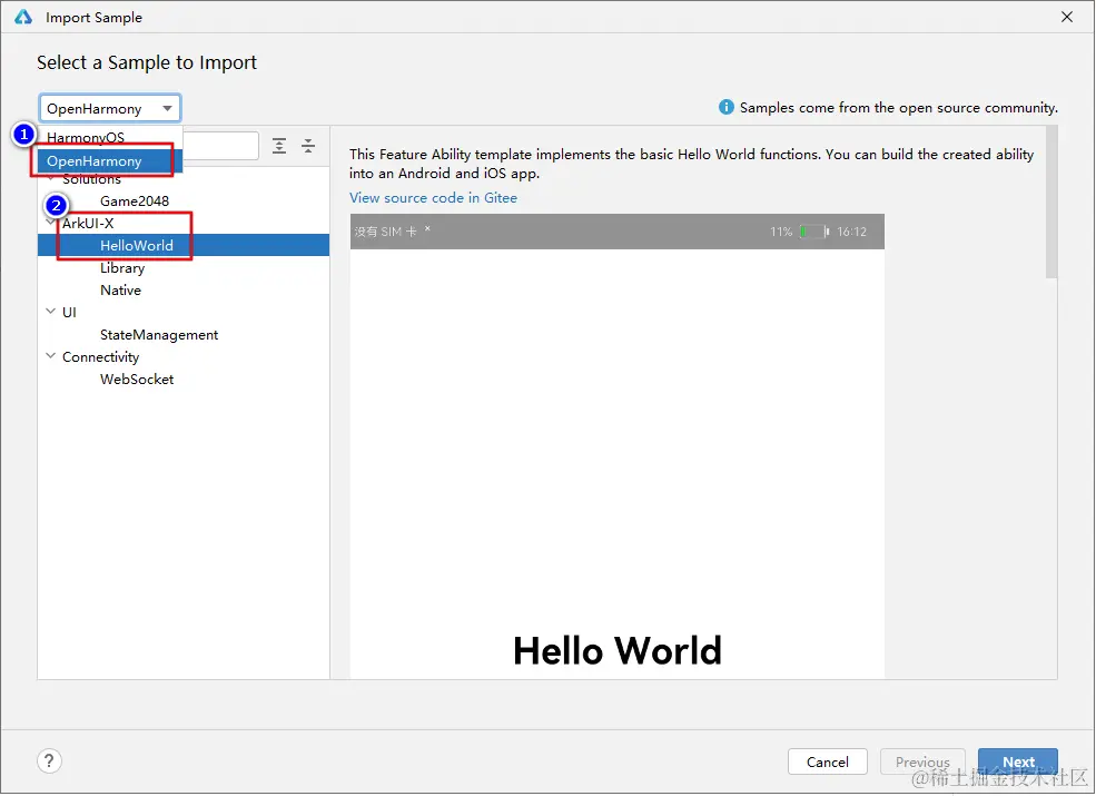 在弹出的对话框中选中OpenHarmony,然后在下方选择ArkUI-X下的HelloWorld项目