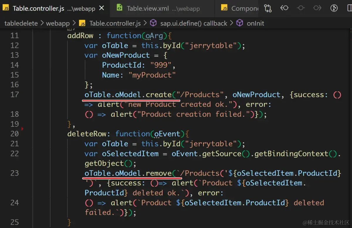 表格控件行项目的添加和删除,直接调用 OData 服务对应的 create 和 remove 方法即可,如下图高亮代码行所示。