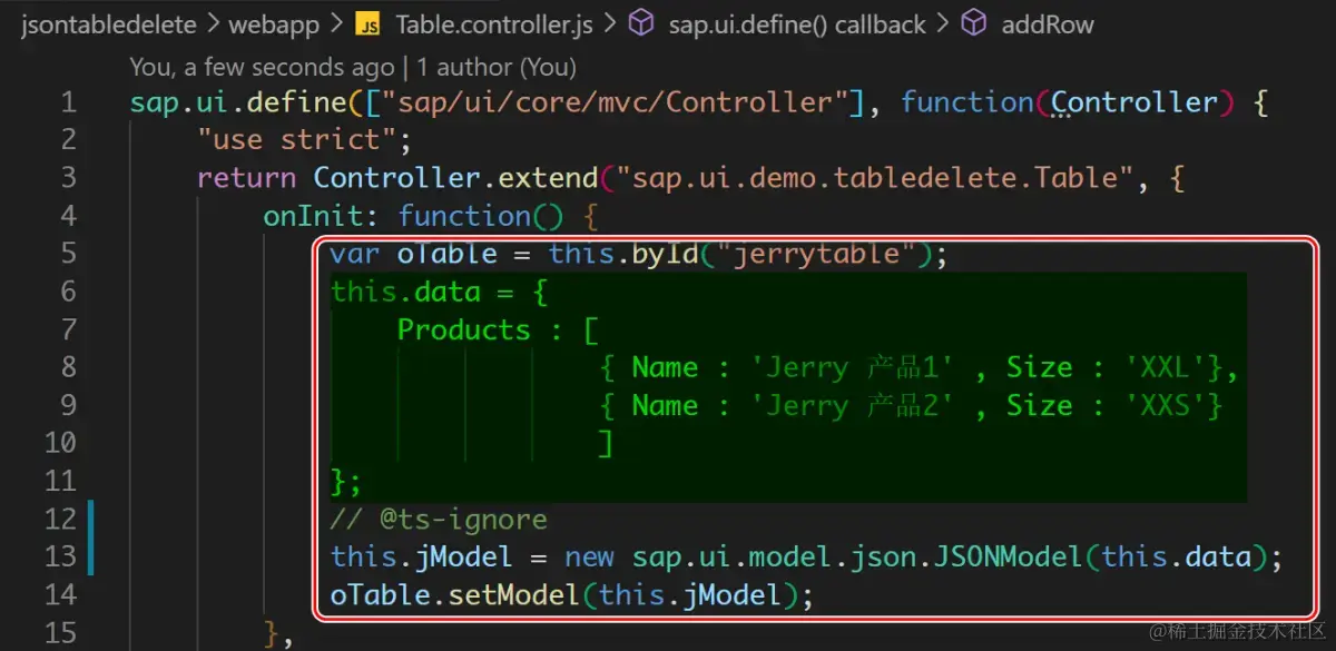 新建 JSON 模型实例,并绑定到表格控件实例的代码如下图所示。其中 this.data.Products 数组变量,维护的是该 JSON 模型硬编码的全部本地数据: