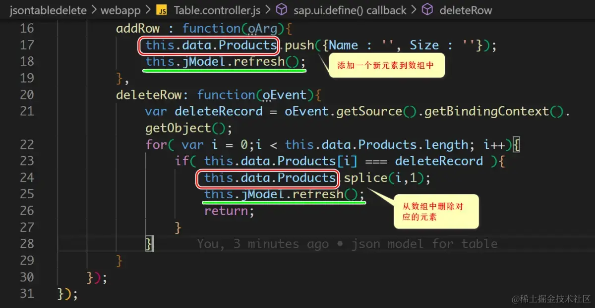用户在界面点击按钮试图添加和删除行项目,我们需要做的操作是修改 JSON 模型绑定的 Products 数组,然后调用 JSON 模型的 refresh 方法,手动触发 UI 的刷新。刷新模型数据之后,通过 JSON 模型的双向绑定机制,就能自动实现 UI 界面的同步刷新。