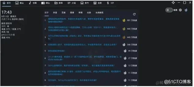 首页左上角显示日期和天气,中间部分有热搜排行,右上角可以切换主题,打开右上角的全局设置,可以进行基本页面设置和保存设置。