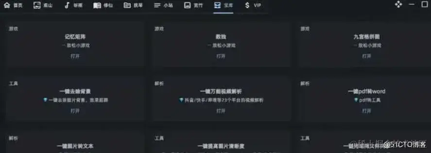 宝库包含了各种工具和小游戏,例如记忆力游戏、九宫格、数独游戏;又例如视频地址解析、pdf转word、局域网文件共享;又例如ai律师、ai求佛等。不过部分功能只支持VIP用户。