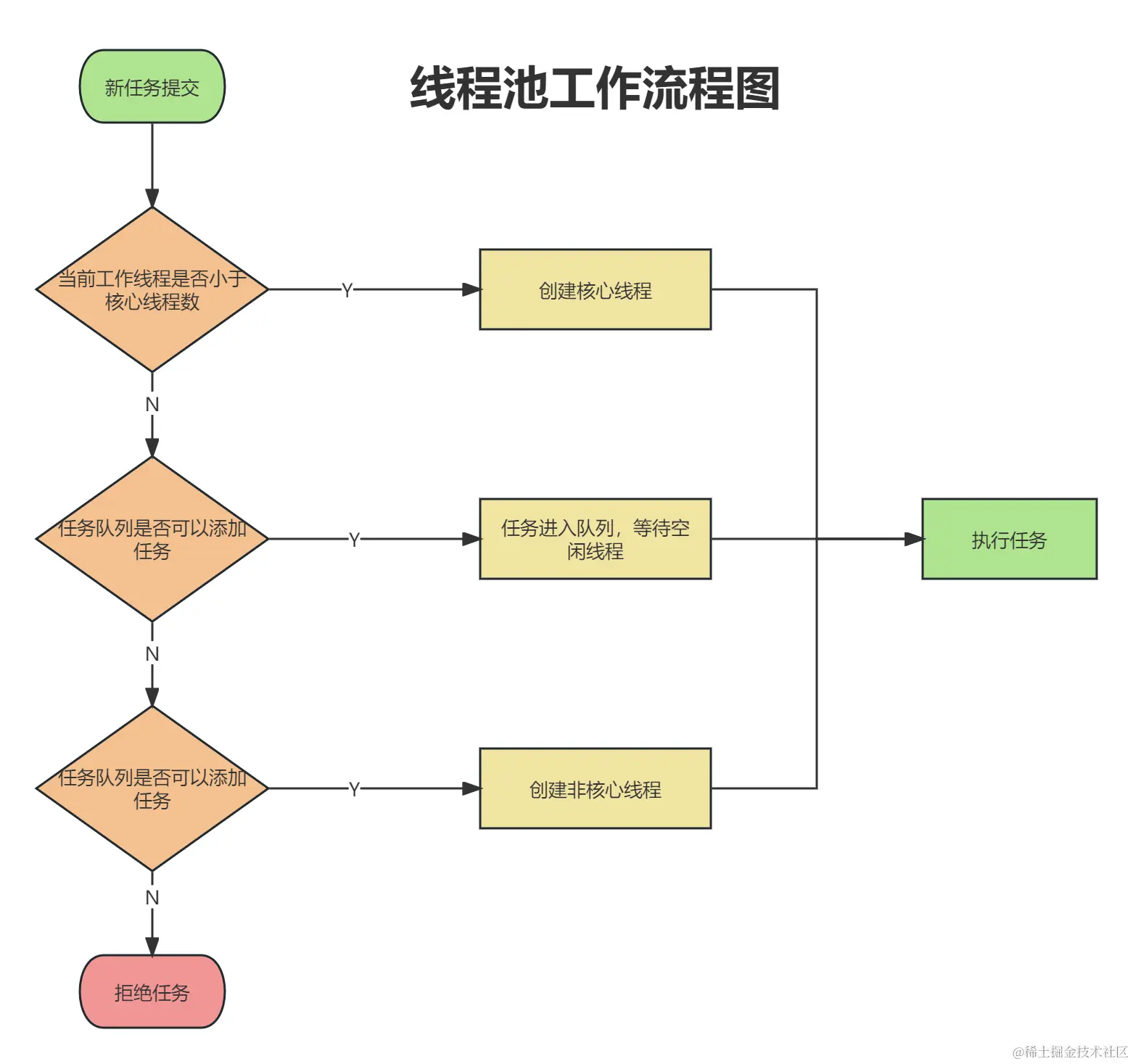 - 工作线程数 ≥ 最大线程数 && 阻塞队列已满: 执行拒绝策略。