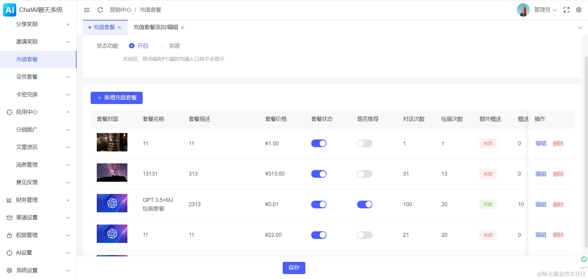 4.充值套餐:后台配置不同的充值套餐,也可以根据用户的反馈添加新的套餐,用户可自行选择需要的套餐。