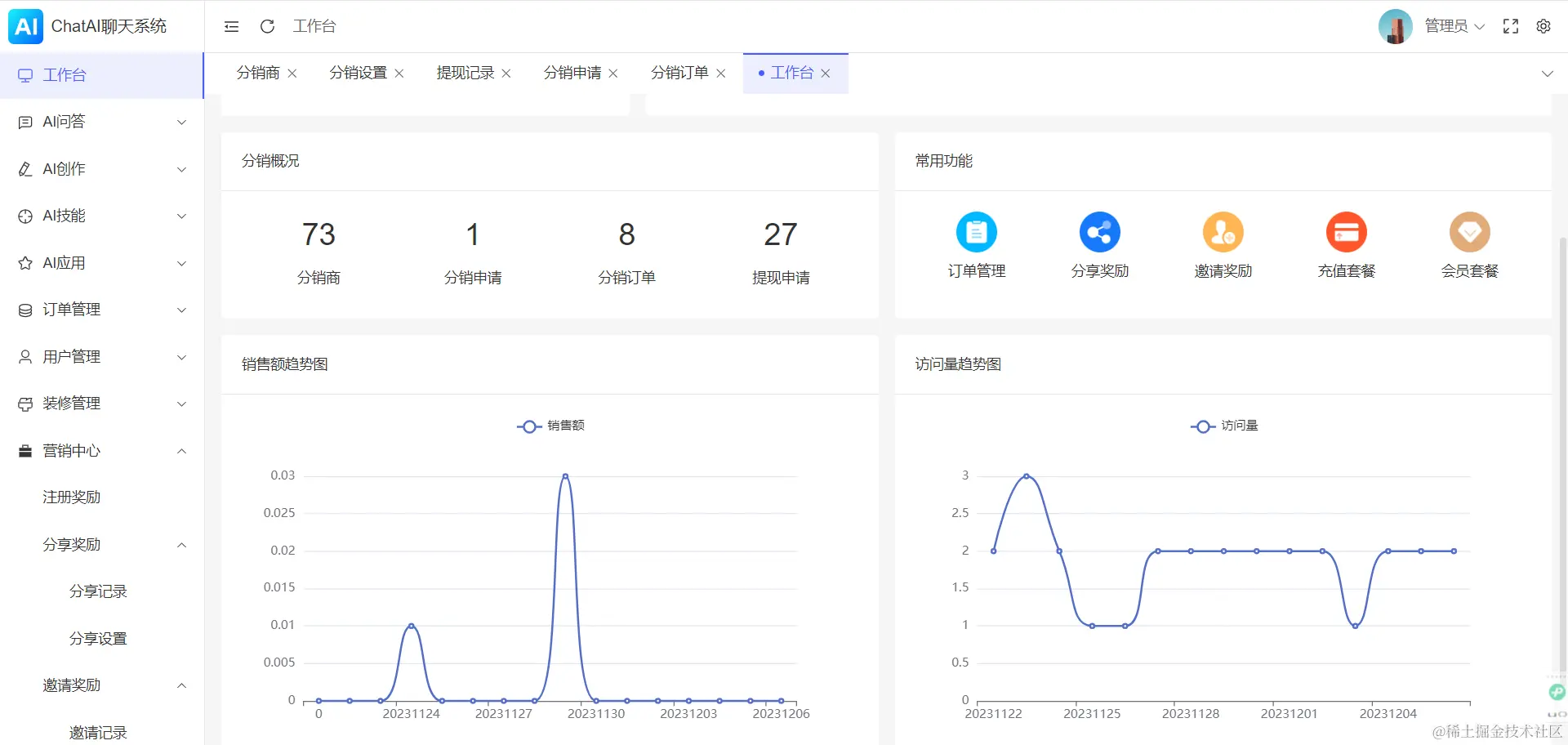 1.分销推广:支持二级分销,用户可以通过申请分销商代理获得收益,也可以通过分享分销链接和二维码,邀请下级实现分销裂变,下级消费,上级则获得相应的分销奖励。