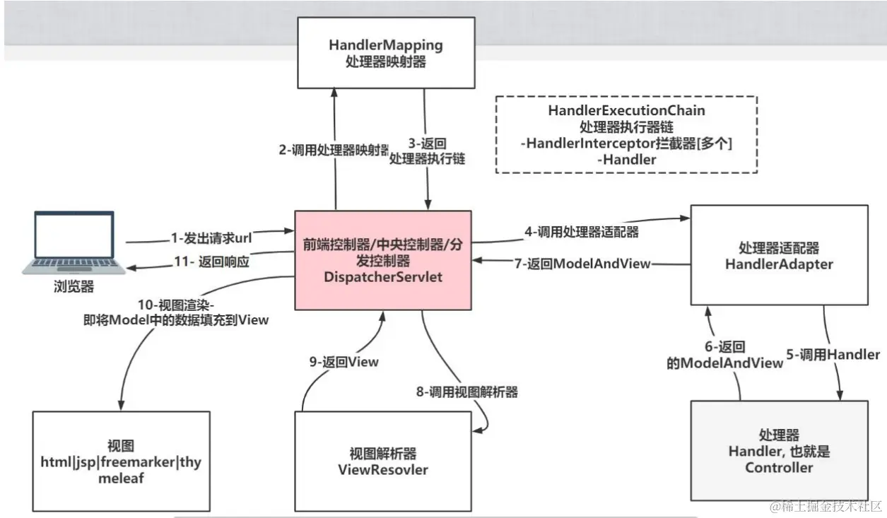 作用:统一处理请求和响应,整个流程控制的中心,由它调用其他组件处理用户的请求