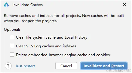 File -> Invalidate Caches... ,可以选择清除 log 缓存与索引或者系统缓存