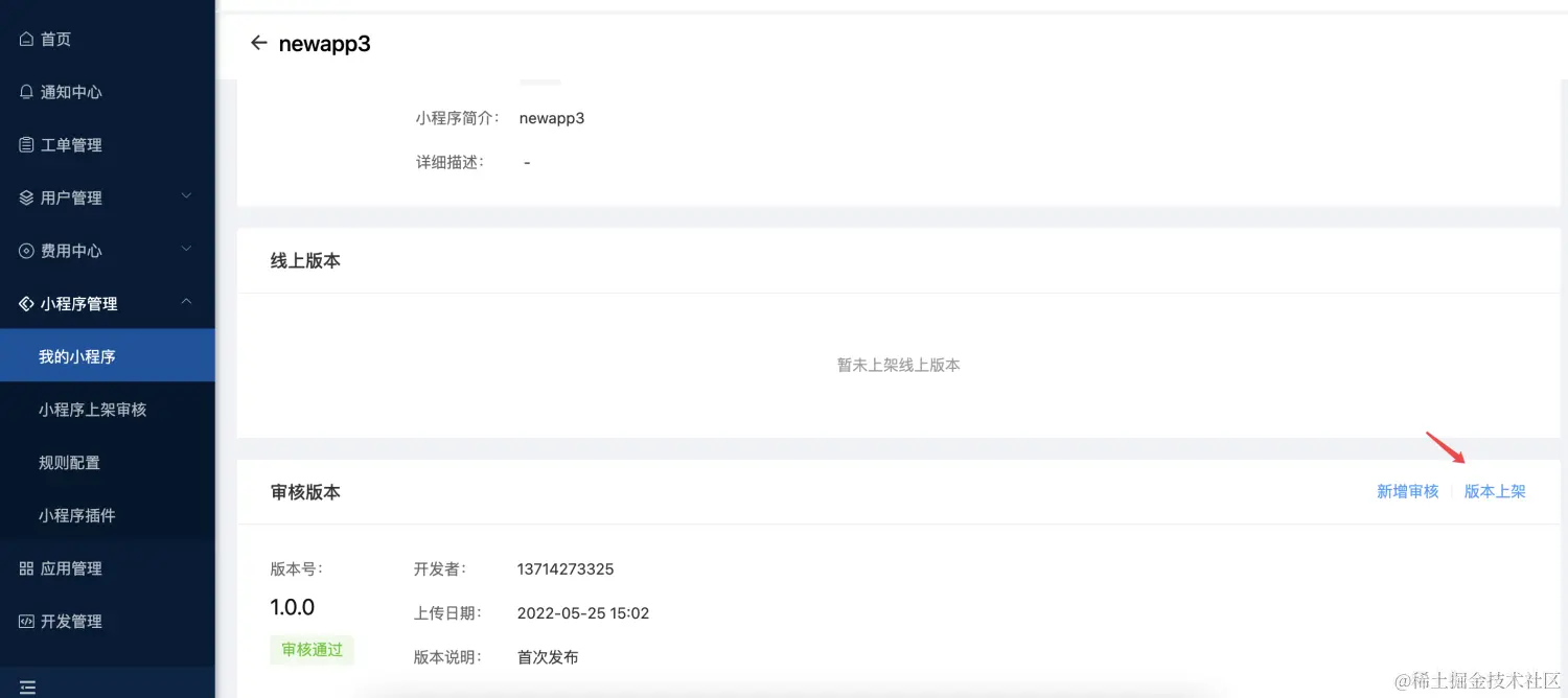 在小程序管理->我的小程序找到newapp3->详情->审核版本->版本上架->确认上架。