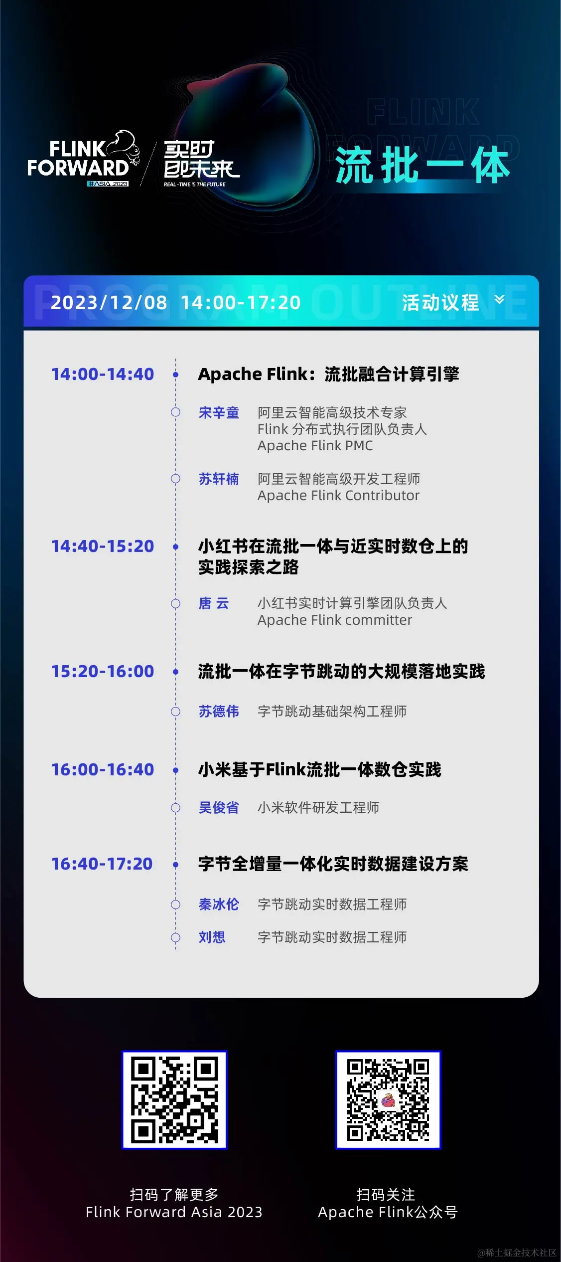 - 流批一体专场:流批一体专场由来自阿里云智能、小红书、字节跳动、小米等企业的技术专家为你呈现流批一体的大规模应用实践案例,了解业务在数仓建设过程中的痛点与思考。另有来自阿里云智能高级技术专家将分享流批融合的理念与优势,结合全增量一体数据处理场景介绍流批融合的技术挑战与设计方案,以及 Flink 社区在这方面的最新进展与未来规划。