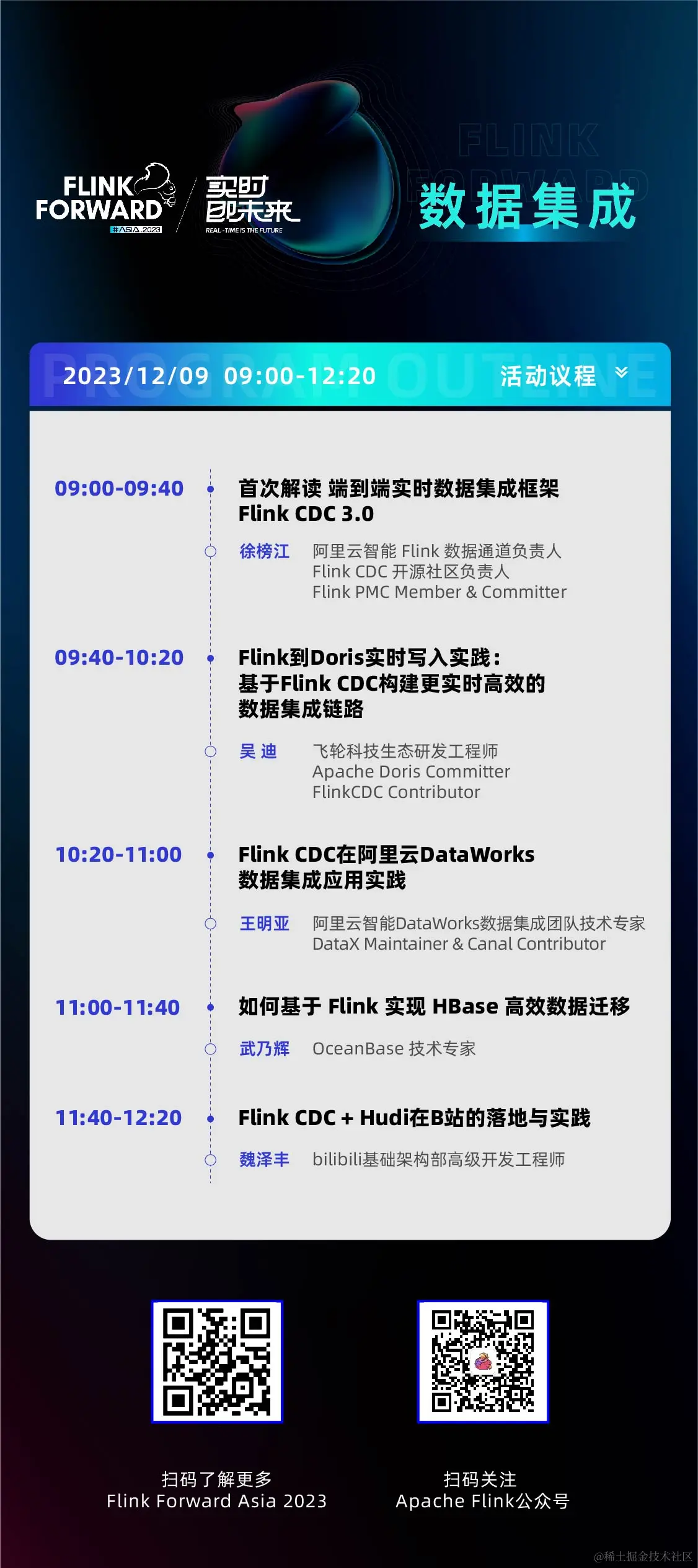 - 数据集成专场:数据集成专场邀请了阿里云智能、飞轮科技、Oceanbase、B 站的技术专家分享基于 Flink 的数据集成系统探索与实践。