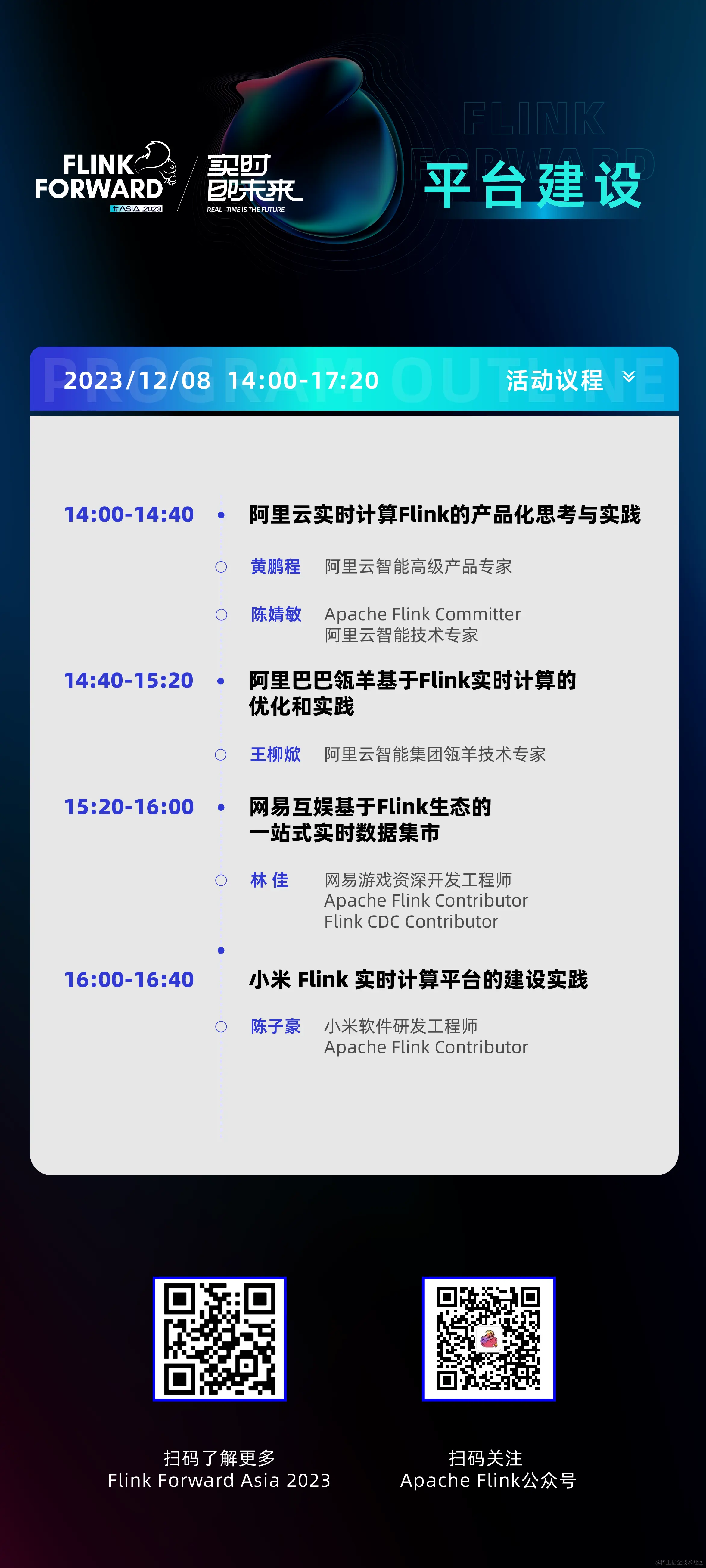 - 平台建设专场:平台建设专场由来自阿里云智能、网易、小米、SelectDB 的技术专家分享基于 Apache Flink 的实时计算平台演进与实践。