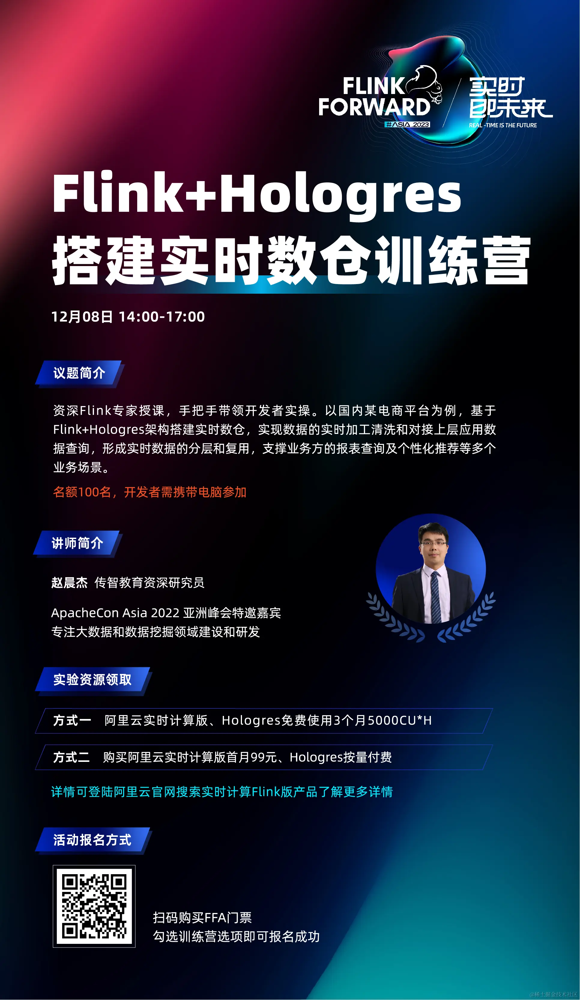 - 实时数仓训练营专场:动手做实践!Flink+Hologres 搭建实时数仓训练营,Flink 专家带您 1-2 小时入门实时数仓经典场景。课程以某电商平台项目为背景,通过搭建一套实时数仓,实现数据的实时加工清洗和对接上层应用数据查询,形成实时数据的分层和复用,支撑各个业务方的报表查询以及个性化推荐等多个业务场景。