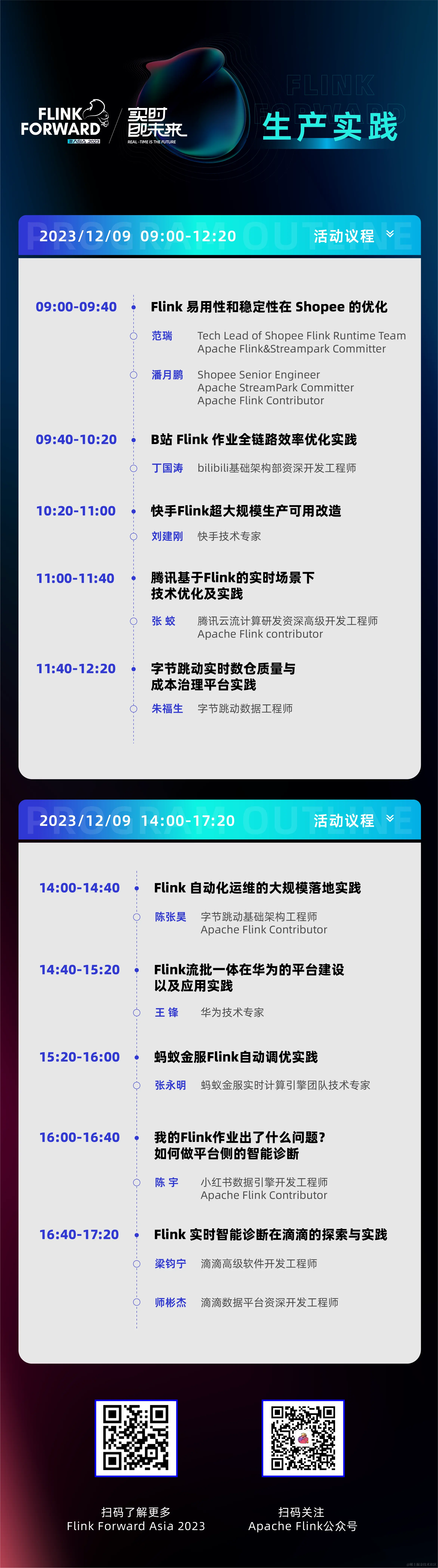 - 生产实践专场:生产实践专场集结字节跳动、华为、蚂蚁金服、Shopee、B站、快手、腾讯、京东物流、小红书的技术专家探讨基于 Flink 的实时场景下技术优化及实践。